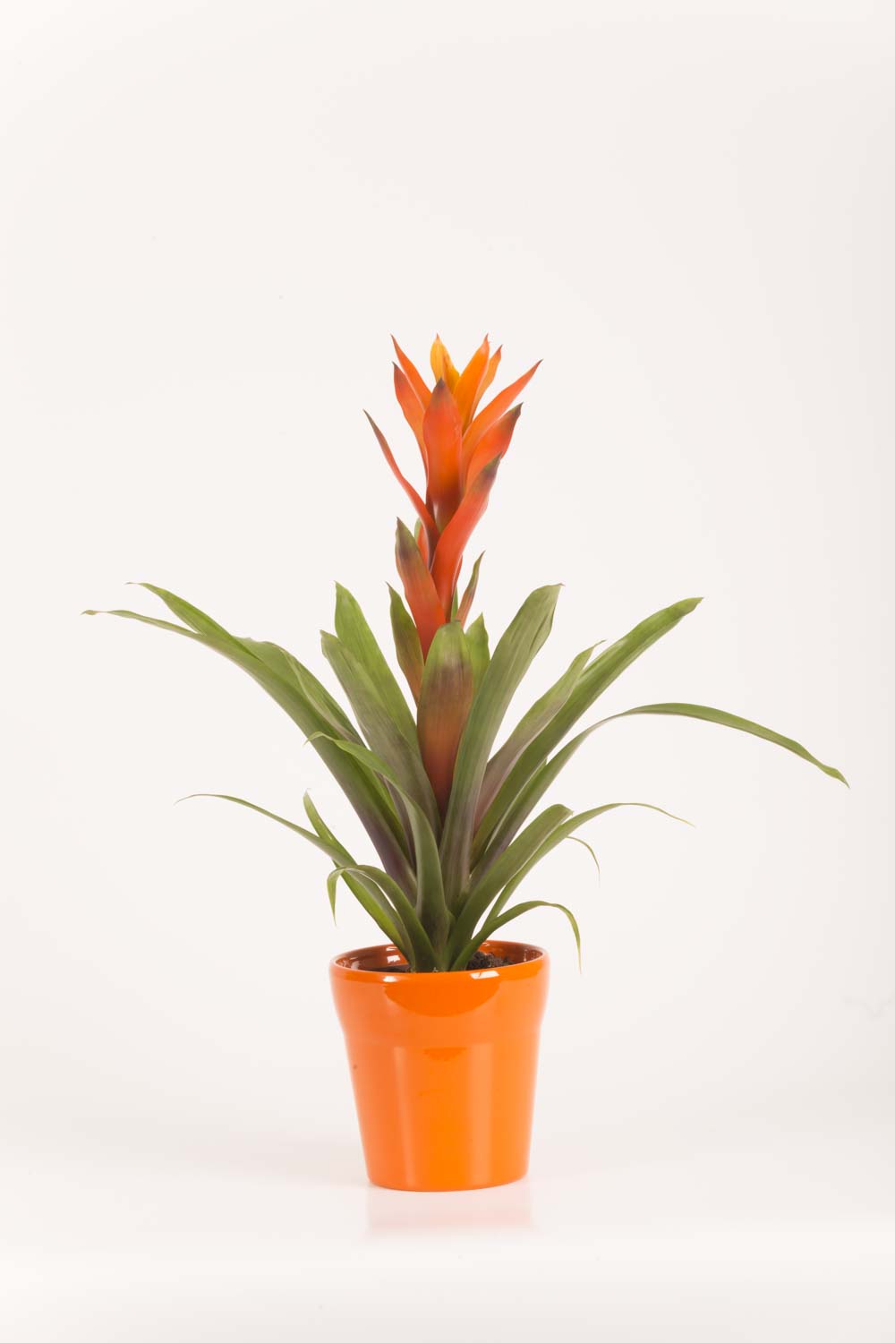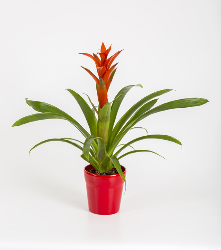 Guzmania con maceta decorativa incluida, tamaño aproximado de 55 a 65 cm de altura, de 12 a 14 cm de diametro. planta de interior facil mantenimiento.