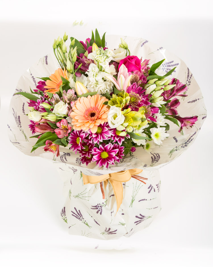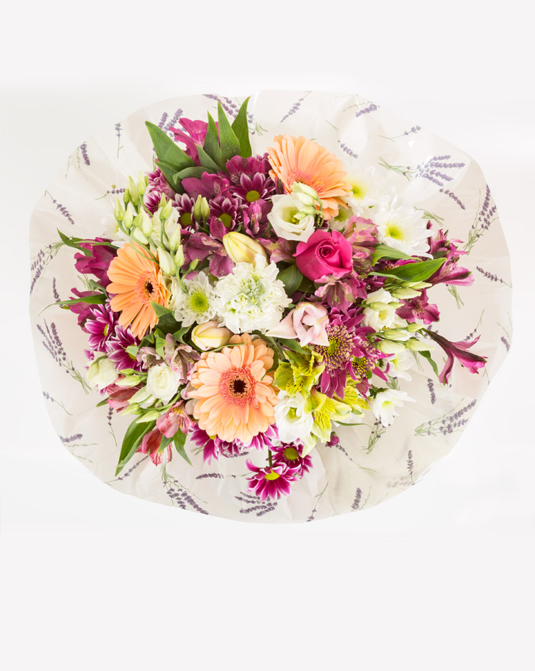 Ramo variado con tonos suaves,compuesto de lilium, gerbera, astromelia, crisantemo de diferentes colores.