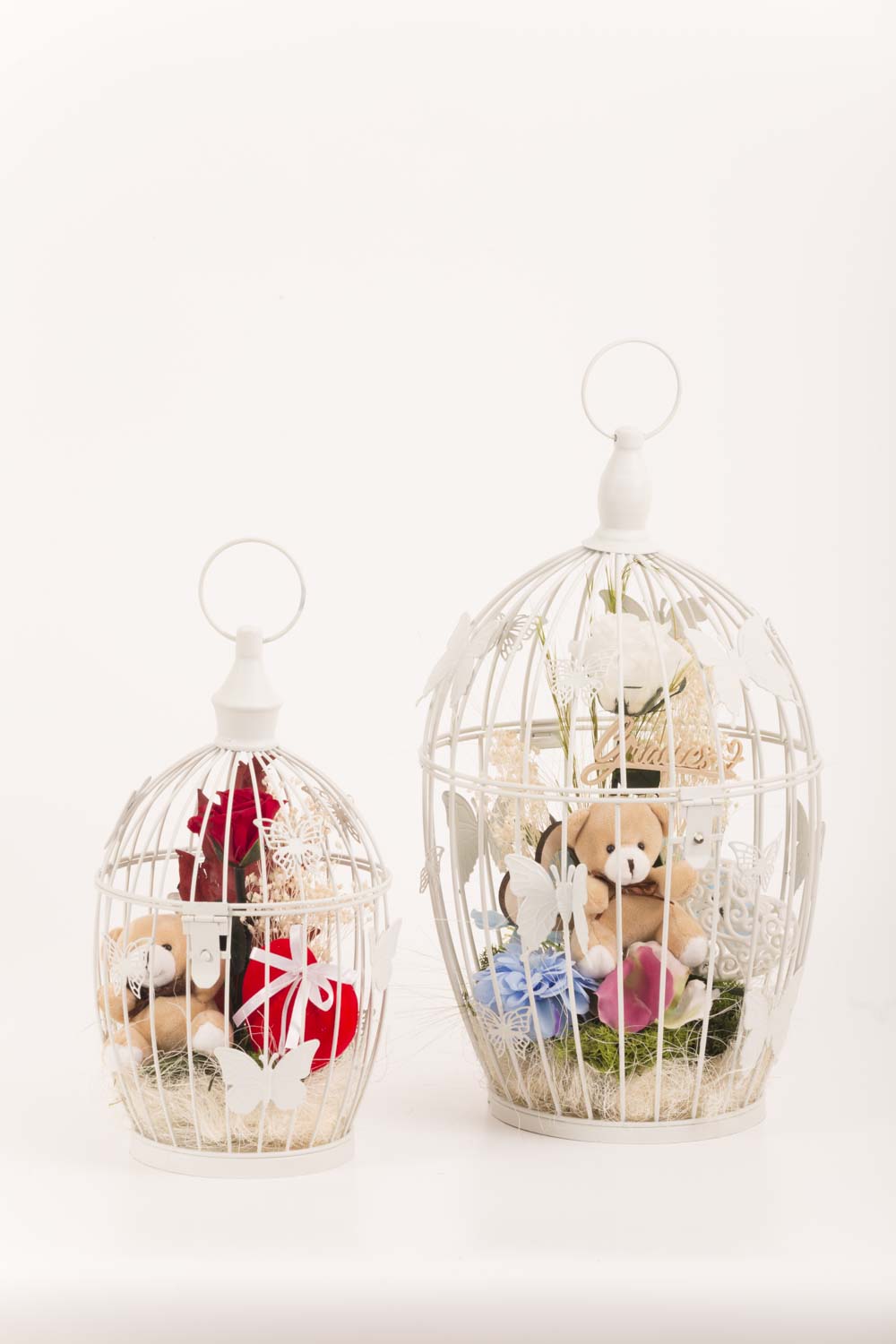 Con posibilidad de cambiar el tipo de jaula y el color, y con posibilidad de cambiar el color de la rosa y sus complementos.